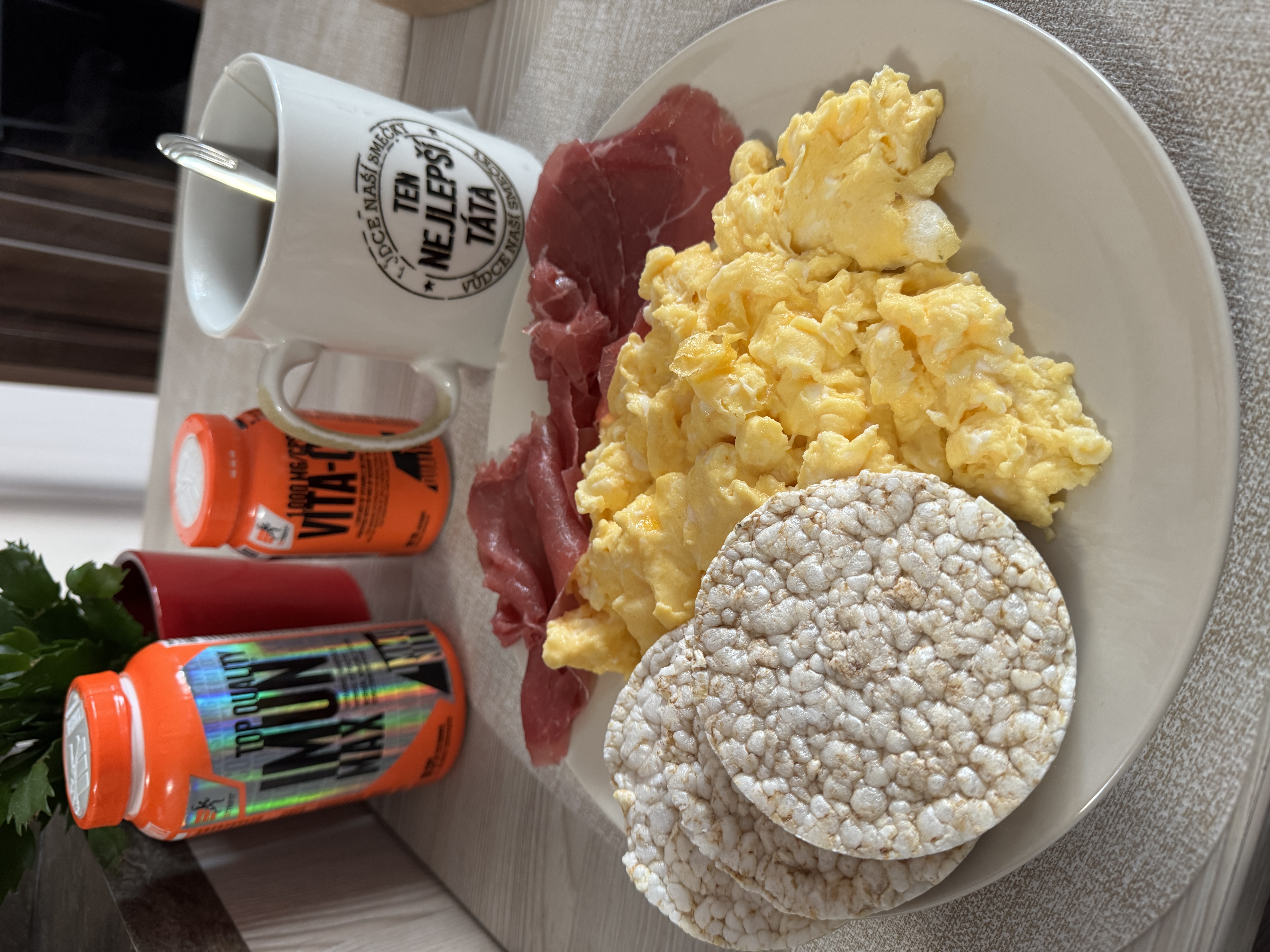 Přijedu ze školy, jdu do práce (čti: domů do pracovny), tam oživím třeba tenhle článek, abyste si ho mohli přečíst, naházím je na všechny možné socky, odpovím na dotazy, které mi tam někdo napíše ve 2 v noci a po 1,5-2 hod je čas na snídani. Jím klasiku. 8 bílků, 3-4 žloutky, pečivo. A k tomu bez výjimky popíjím Flexain a přidám vitamíny. Je Flexain potřeba? Nóoo, je mi asi tak 200 let a je na čase se o klouby trochu starat kvalitní kloubní výživou, ale v komentářích jsem se dočetl, že stačí jíst sulc, vepřová kolena a tak.. Budu smířlivý, tak řeknu budiž… Až na to, že já nechci vypadat jak dárce toho kolena a nechci mít tělo pokryté sulcem. Takže musím dát přednost Flexainu. Méně smířlivá odpověď je, že to je totální hovadina, protože abyste dostali stejné množství těch látek, museli byste jíst tyhle srajdy od rána do večera. Ono to v menší míře platí i pro ty vitamíny. Užívám ImunMax, vita C a V52. Ve V52 je 52 nejrůznějších vitamínů, v ImunMaxu najdete víc minerálů než v převodovce Porsche a vitamin C všichni známe. Jasně, můžete se cpát ovocem a zeleninou od rána do večera, ale při dnešní ceně papriky to je na bankrot a zároveň je s tím trochu problém v momentě, kdy držíte dietu. Já sám se v dietě fruktóze z ovoce nevyhýbám, ale zase toho nemůžu jíst kila. A po 1-2 jablkách těch vitamínů do sebe moc nedostanete…